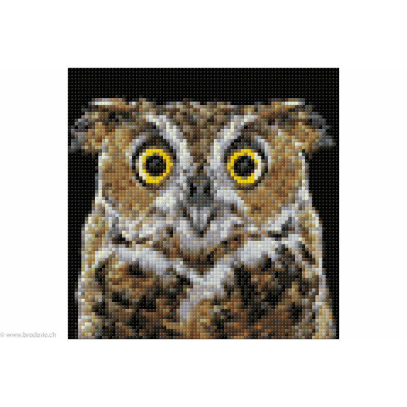 Wizardi, kit diamant Curious Owl (art. WIWD2380). Dimensions: 20 x 20 cm. Kit complet de Broderie Diamant comprenant la toile adhésive imprimée à recouvrir de strass, les sachets de strass 'diamants' carrés triés par couleurs, un stylet et sa cire, un réceptacle et les explications. La totalité de la surface est à recouvrir. ATTENTION, ce n'est pas une broderie, pas de fil ni d'aiguille, mais une mosaïque.