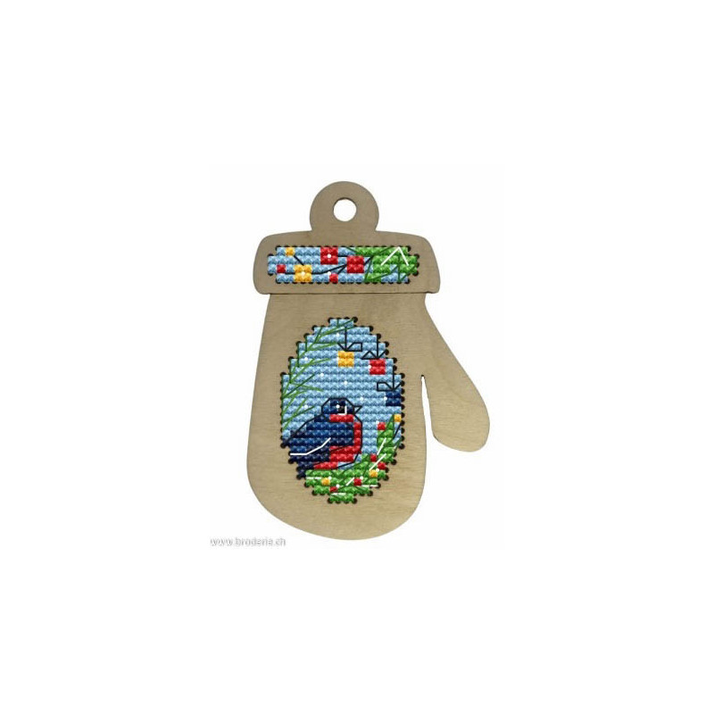 Wizardi, kit Kind fox - Christmas mitten - bullfinch (art. WDKF022-6-4). Largeur: 6.9 cm. Broderie de points de croix comptés 5.5 points/cm sur support en bois, à pendre ou à poser. Dans la même collection WDKF0et numéro.
