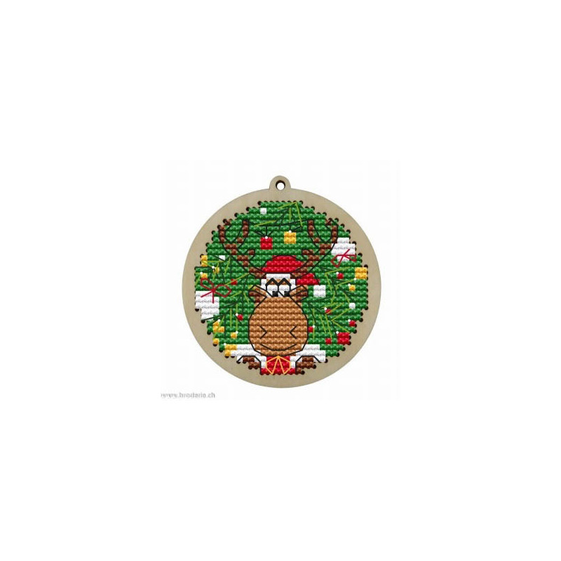 Wizardi, kit Kind fox - Christmas Ball Deer (art. WDKF022-8-2). Dimensions: 6.5 x 7 cm. Broderie de points de croix comptés 5.5 points/cm sur support en bois, à pendre ou à poser. Dans la même collection WDKF0et numéro.