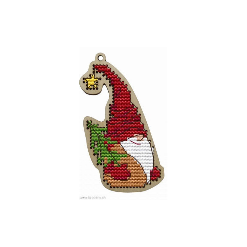 Wizardi, kit Kind Fox - Gnome with Christmas Tree (art. WDKF022-80). Dimensions: 5 x 8.5 cm. Broderie de points de croix comptés 5.5 points/cm sur support en bois, à pendre ou à poser. Dans la même collection WDKF0et numéro.