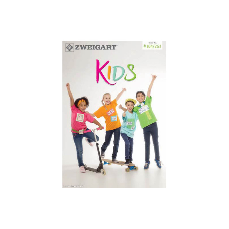 Zweigart, catalogue de modèles Kids (art. 104-263). Catalogue de points de croix comptés de 20 pages, modèles prévus sur les trames 3.2 points/cm 1006 en divers coloris.