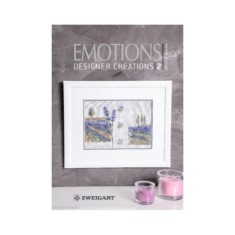 Zweigart, catalogue de modèles Emotions (art. 104-286). Catalogue de 27 pages, avec une création de chaque artiste suivant: Ulrike Blotzeim, Margaret Grandjot, Nathalie Cichon, Rossana Gallo, Sara Guermani, Judith Whitman, Marylise Grospeaud, Celine Merdrignac, Alessandra Adelaide Beretta, Suzanne Schnmidt, Soizic Vanney Gatineau, et Isabelle Mazabraud.